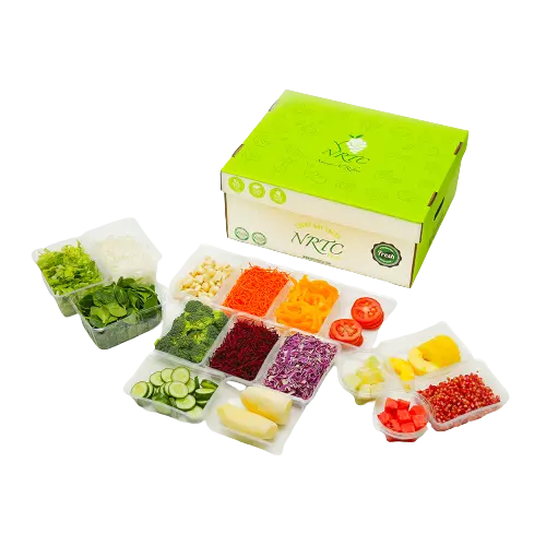 Mommy’s Helper Box Potato Peeled (Sanitized), Garlic Peeled (Sanitized), Romaine Shredded Lettuce (Sanitized), Red Cabbage (Shredded), Broccoli Floret, Carrot (Shredded), White Onion (Chopped), Yellow Capsicum (Julienne), Cucumber (Sliced), Beetroot (Sticks/Shredded), Tomatoes (Sliced), Baby Spinach (Sanitized), Pineapple (Pre-Cut), Pomegranate (Peeled), Honeydew Melon (Cubes) and Watermelon (Cubes) |